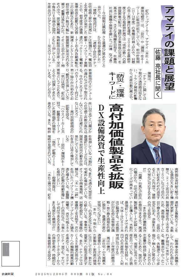(出典)2025年12月5日(金)付鉄鋼新聞3面 「アマテイの課題と展望 佐藤 亮社長に聞く」