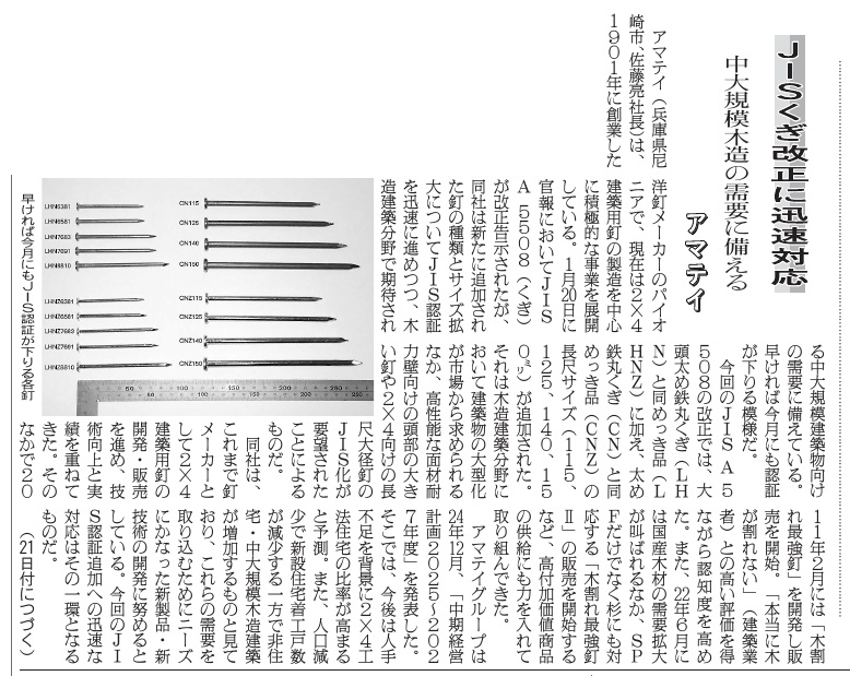 (出典)2026年4月20日(月)付日刊木材新聞5面「JISくぎ改正に迅速対応 中大規模木造の需要に備える アマテイ」
